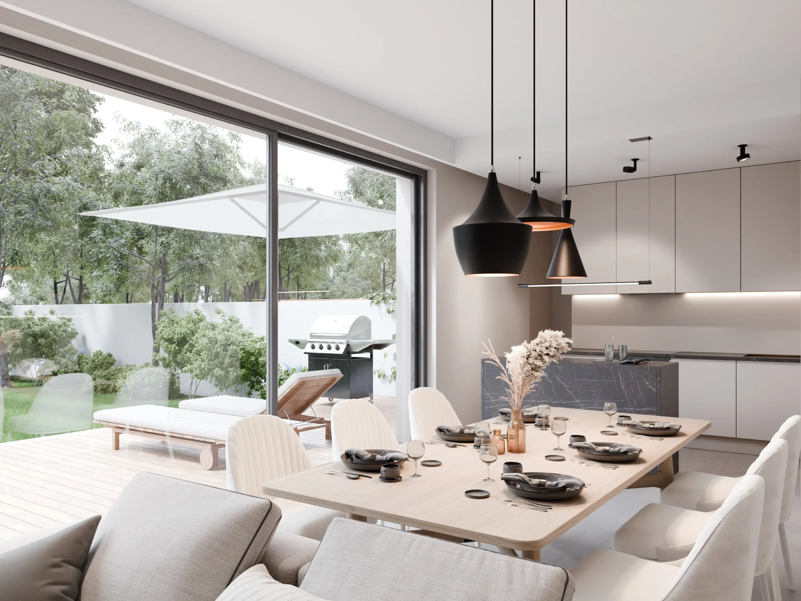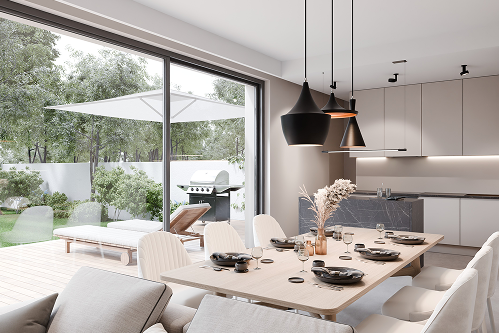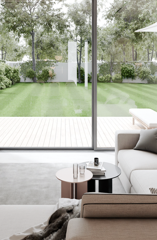 Domy zaprojektowane w idealnym układzie względem stron świata. Słoneczne tarasy od południa, imponujące przeszklenia salonu i duże okna w sypialniach sprawiają, że słońce towarzyszy Ci od poranka aż do wieczoru.